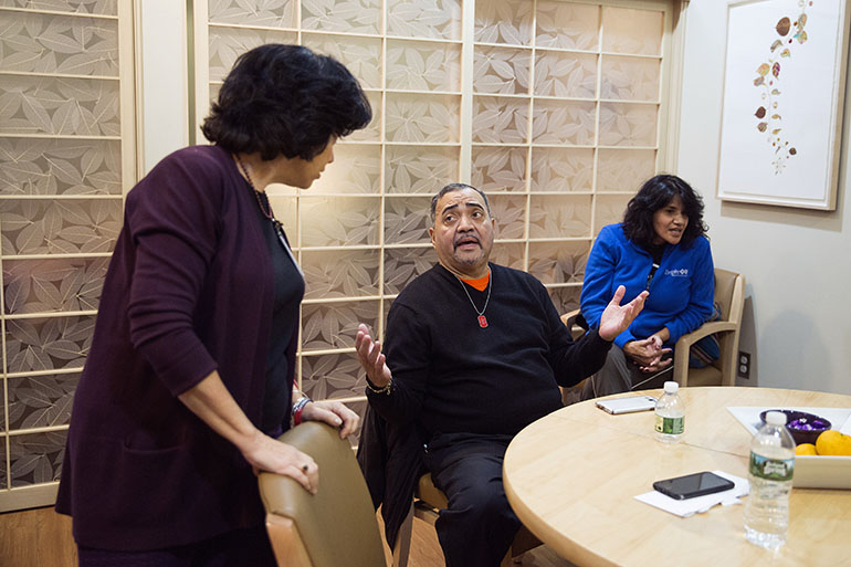 Ramon Santiago III, who sells life insurance, was alone at the hospital, waiting for his father to emerge from two major surgeries 鈥 a heart and kidney transplant. He stopped in to use the center’s聽computers, and stayed to chat with Kaplan over coffee. He also met volunteer Elvin Olivera, a liver transplant survivor who announced himself as living proof that organ transplants work.
