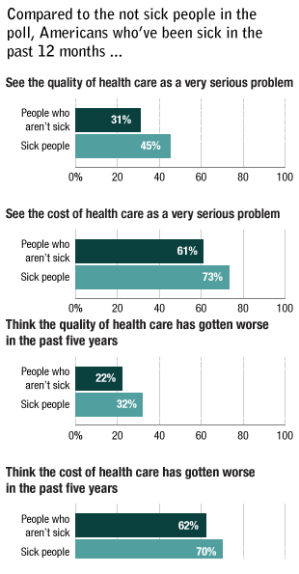 The recently ill are more likely to say the cost and quality of care have worsened over the past five years, compared to people who weren’t sick.