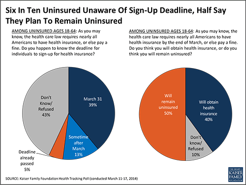 The Kaiser Family Foundation’s latest poll, conducted in mid-March,聽found that 50 percent of adults under age 65 who still lack coverage plan to remain without insurance, while 40 percent aim to sign up by the deadline at month’s end. (KHN is an editorially independent program of the foundation.) The other 10 percent said they did not know what they would do or refused to talk about it.