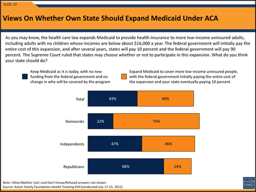 Nationally, two out of three people surveyed by the Kaiser Family Foundation said they had a favorable view of expanding Medicaid to cover more low-income uninsured adults. (KHN is an independent program of the foundation.) As has been the case with the law generally, the views reflected partisan viewpoints, with 87 percent of Democrats and 67 percent of independents favoring the expansion. Among Republicans 39 percent favored the expansion as a general concept, more than three times as many as said they like the law.