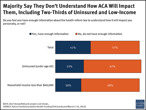 Sixty-seven percent of the uninsured younger than age 65 — and 57 percent of the overall population — say they do not understand how the聽ACA will impact them, according to a poll released Wednesday by the Kaiser Family Foundation (KHN is an editorially independent program of the foundation). The poll also found that Americans’ expectations of how the law will affect health care costs, quality and consumer protections are more negative than positive.