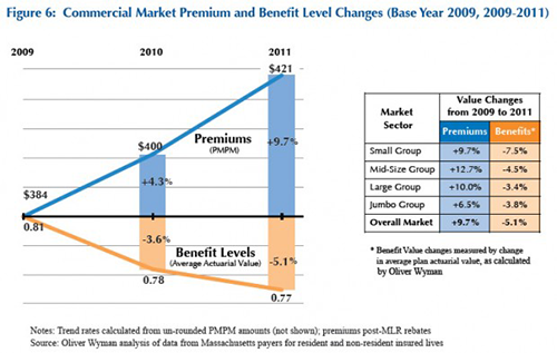 聽says Bay State premiums rose 9.7 percent between 2009 and 2011, while the value of that coverage shrank 5.1 percent.