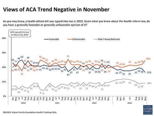 Nearly half of Americans now hold an unfavorable view of the law and only a third like it, according to from the Kaiser Family Foundation. (KHN is an editorially independent part of the foundation.)聽 The 16-percentage point gap between positive and negative views is almost the largest it has been since the foundation began its monthly tracking poll in April 2010. The only time the gap was bigger was in October 2011, when the Republican presidential candidates, gearing up for the primary season, 聽were taking turns bashing the law.